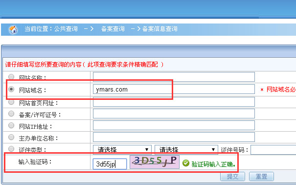 第四步,我們?cè)谟覀?cè)輸入我們要查詢的網(wǎng)站和驗(yàn)證碼(這里我們以征帆網(wǎng)絡(luò)網(wǎng)址"ymars.com"為例,給大家說明)